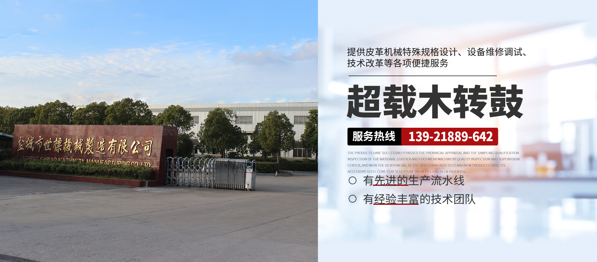 本公司常年提供超載木制轉鼓( 意大利/西班牙版本)、GJOB1-2型懸掛式木制轉鼓、鐵制轉鼓、Y型不銹鋼全自動分格鼓、全自動不銹鋼圓形、八角形摔軟轉鼓、PP染色等多功能轉鼓、HC系列劃槽、不銹鋼試驗轉鼓等皮革機械產品,產品暢銷浙江、山東、廣東、福建、河南、河北、四川、新疆、遼寧等地,且遠銷非洲、東南亞、南美洲、中美洲等多國,深受各大制革廠家的青睞。產品相繼通過省級鑒定和全國皮革、制鞋機械質量檢測監督中心的抽樣合格檢驗,在2010中國高新技術、新產品博覽會上一舉榮登銀獎寶座,其配件鋼芯泥塑鼓樁獲 專利權。本公司并向客戶提供皮革機械特殊規格設計、設備維修調試、技術改革等各項便捷服務,具有健全的檢測體系和可靠的售后服務。